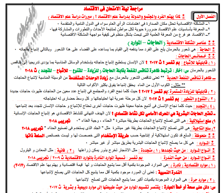 اهم 11 ورقة لمراجعة ليلة امتحان الاقتصاد للثانوية العامة سؤال وجواب